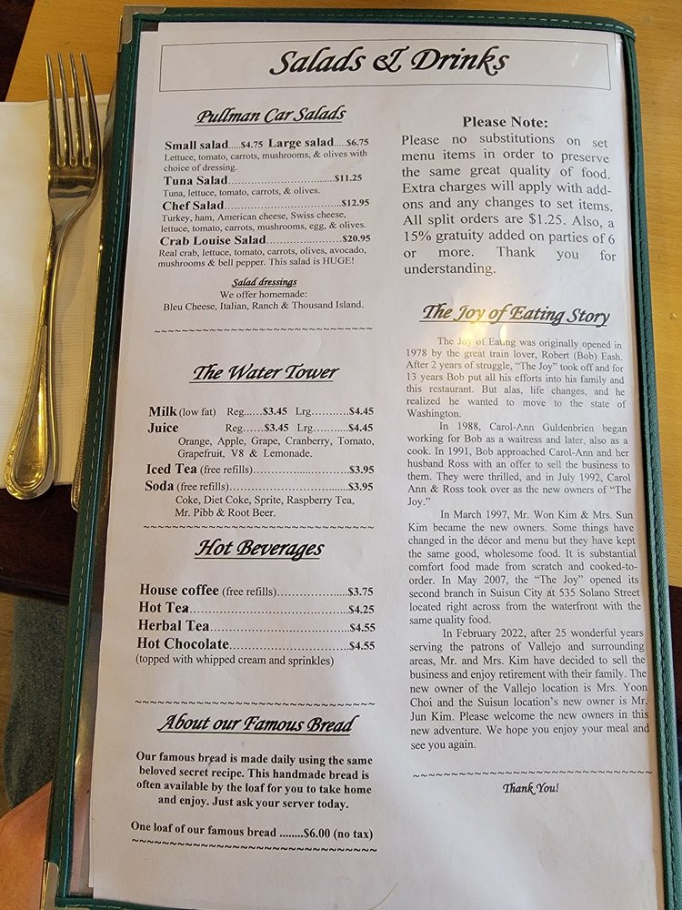Located in Suisun City, CA, Joy of Eating offers a delightful menu filled with breakfast and brunch options. From classic dishes like Chicken Fried Steak and Eggs to customizable omelettes and mouth-watering waffles, there is something for everyone to enjoy. The homemade bread adds a comforting touch to every meal. Customers rave about the generous portions, friendly service, and cozy diner ambiance. Don't miss out on the must-try items like the Eggs Benedict, BLT, and French Toast. Whether you're stopping by for a quick bite or a leisurely meal, Joy of Eating promises a satisfying dining experience. Visit them for a taste of old-fashioned, down-home breakfast favorites with a modern twist.
